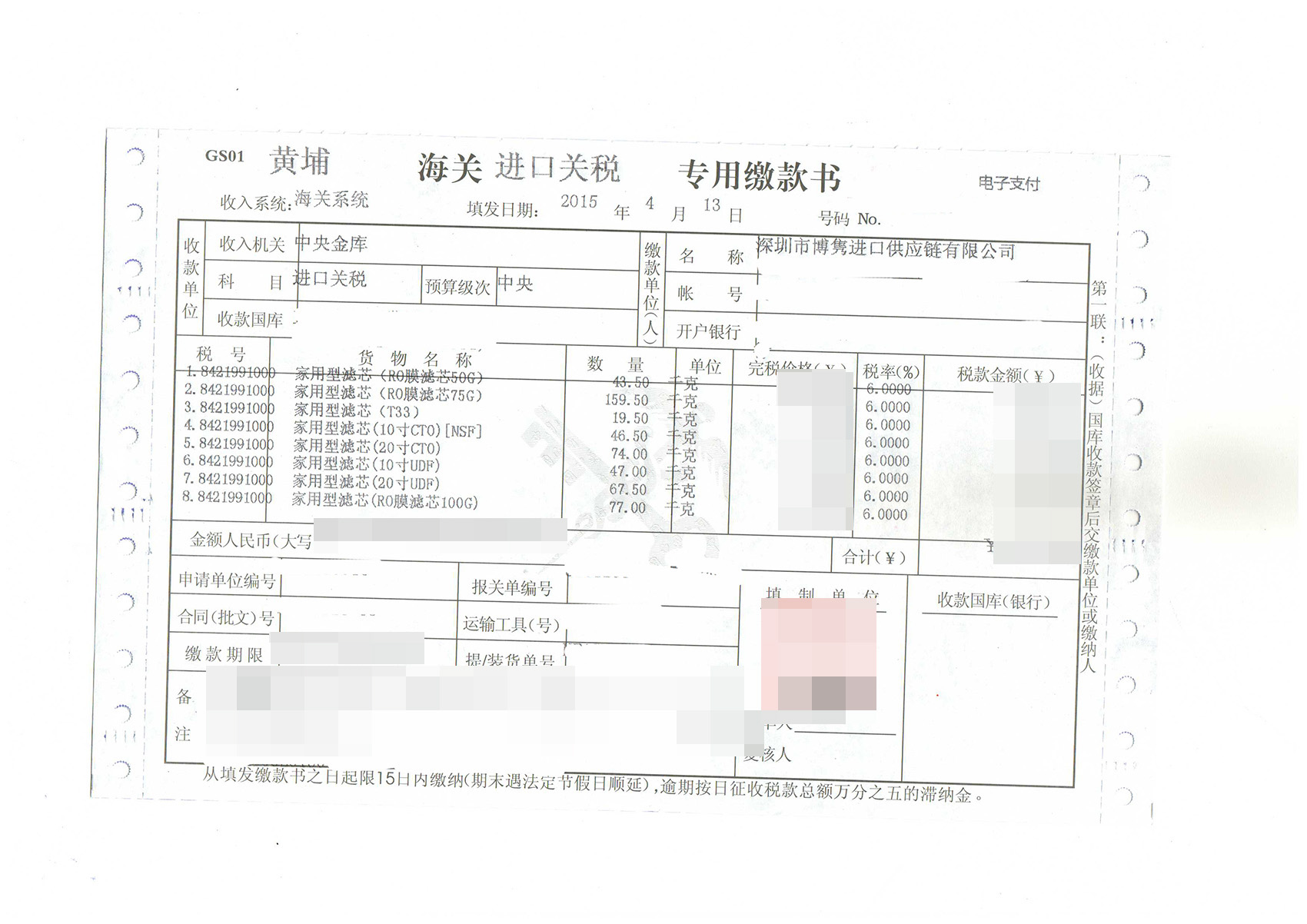 濾芯進口報關案例